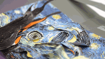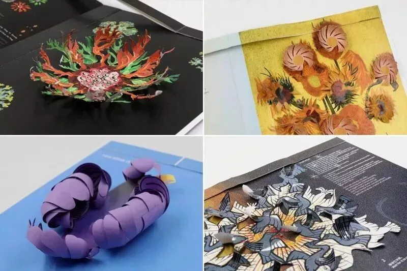 打开书本,用热吹风给书升温,书上的孔雀就会缓缓开屏,小狗开始翻动耳朵,而梵高的名作《向日葵》和《星空》都跃动了起来……