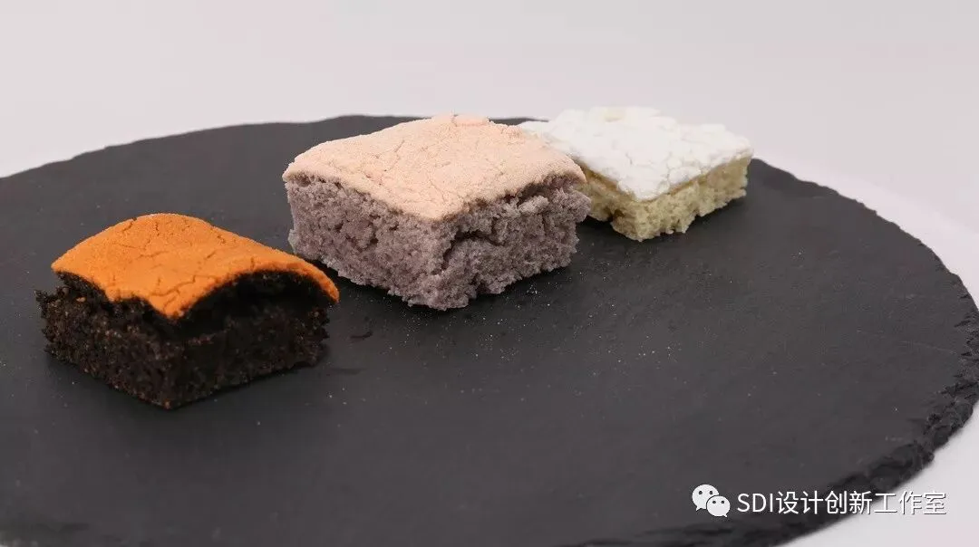 玉米粉与红曲粉天然的颜色,增加了糕点的视觉层次。底部的蓬松的玉米口感与上部的香脆形成口感上的对比。可以一根一根食用的香脆条条也增加了食用的趣味性。