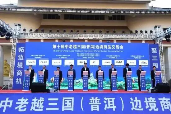 随后,来自中国、老挝、越南的代表团领导共同上台启动了第十届中老越三国(普洱)边境商品交易会。中国、老挝、越南三国的演出嘉宾为现场的观众带来了精彩的文艺展演。