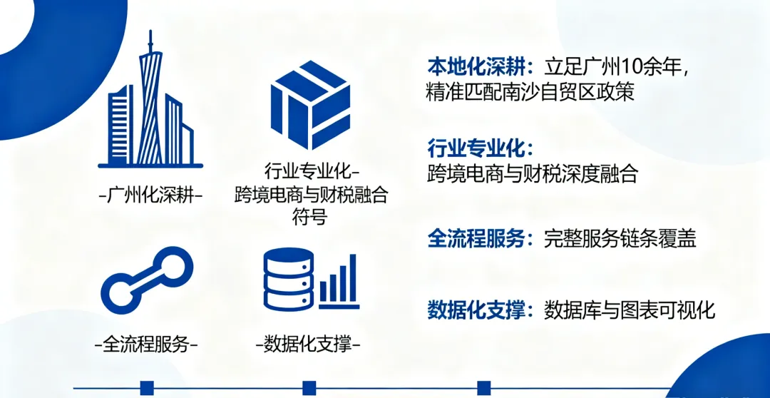 本地化深耕:立足广州 10 余年,深谙广州跨境电商综试区、南沙自贸区等本地政策,能精准匹配企业政策红利需求; 行业专业化:专注跨境电商财税服务,团队成员具备跨境电商行业背景与财税专业资质,懂行业、懂政策、懂实操; 全流程服务:从风险排查、方案设计、落地执行到长期维护,提供 “一站式” 服务,无需企业多头对接; 数据化支撑:采用专业财税管理系统,实现发票归档、申报流程、政策跟踪等数字化管理,提升服务效率与准确性。