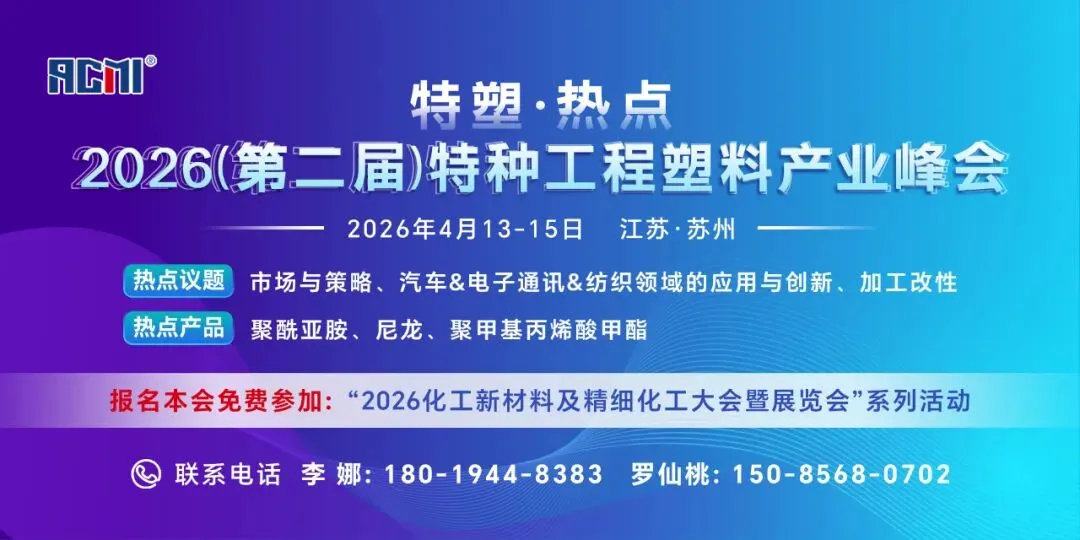 我院定于2026年4月13-15日在江苏苏州举办2026化工新材料及精细化工大会暨展览会(ACMIE2026),以及“特塑·热点 | 2026(第二届)特种工程塑料产业峰会”。