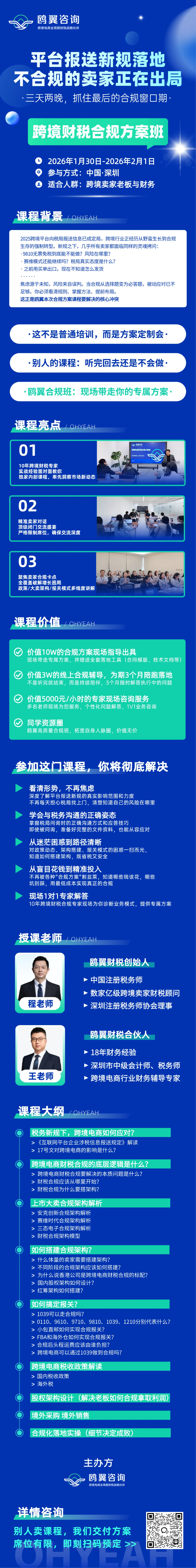 另外,本月月底鸥翼咨询将会举办一场跨境财税方案班,创始人程老师也会亲自出席讲到新规及税务应对等内容,感兴趣的朋友抓紧约起来~详情如下图
