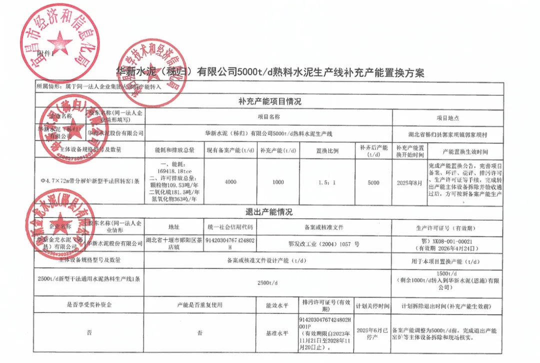 根据公示,华新水泥(秭归)有限公司一条4000t/d水泥熟料生产线置换产能,调整后产能增至5000t/d,置换比例1.5:1。