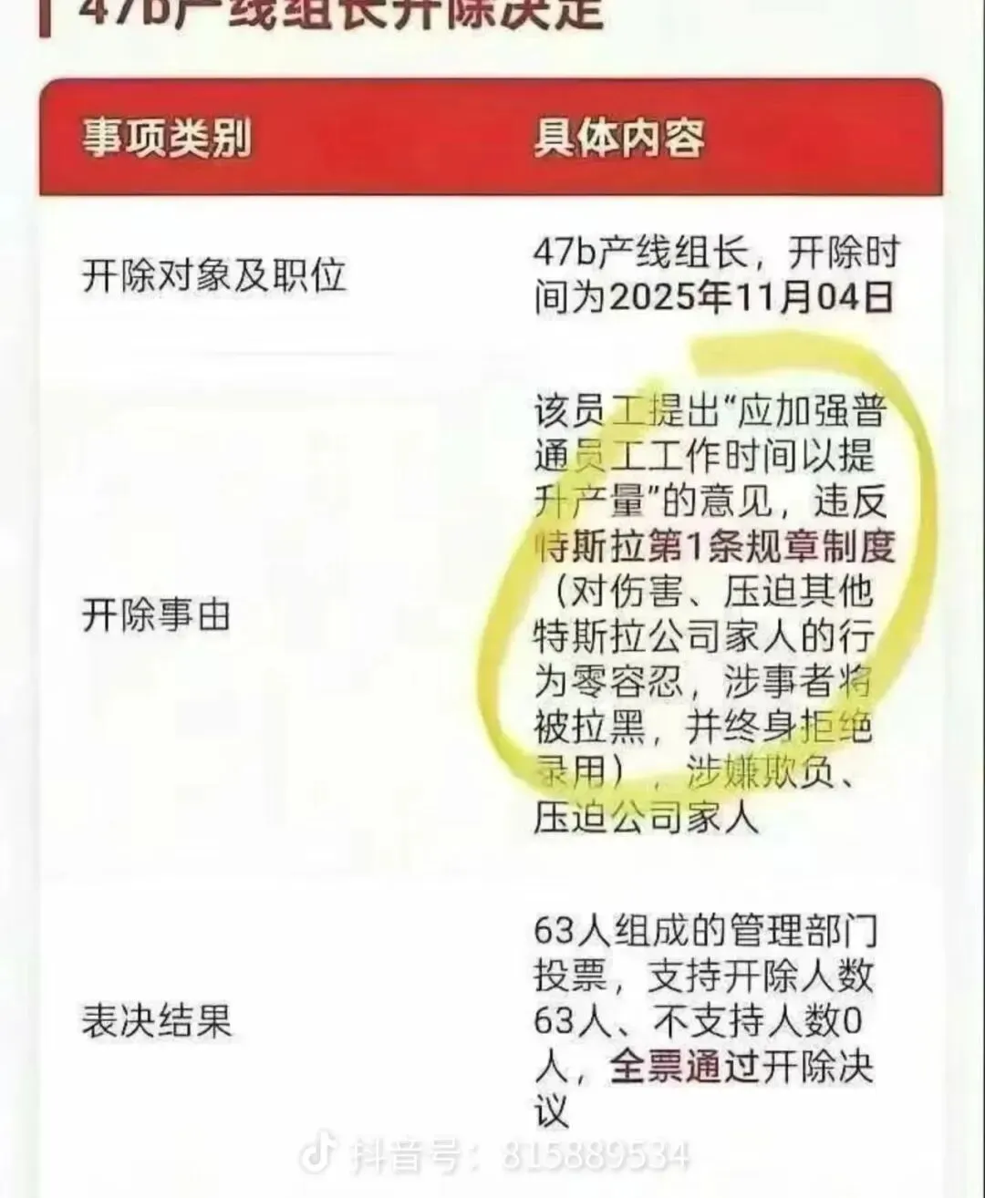 近期上海特斯拉一则开除决定公告引发了全网愤议,愤议不是特斯拉开除员工,而是该工厂一名产线组长提出“通过增加员工加班时长提升产能”的建议,被公司以违反员工行为准则的章程“禁止对同事造成身心压迫”为由开除,且通过63人组成的管理委员会全票通过该决定,明确终身不得回工厂工作。