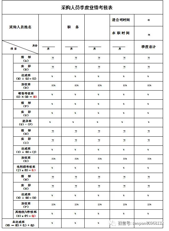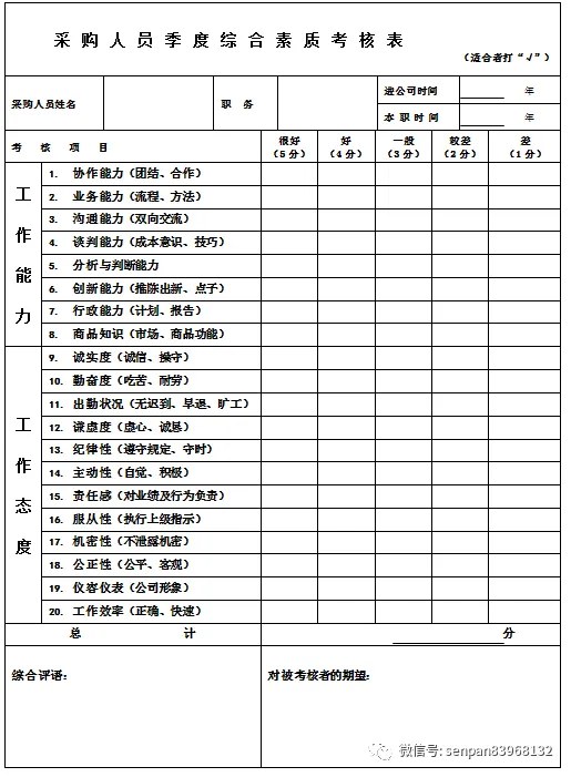 把以上五点做好,采购人员的管理工作基本上就可以顺利完成。“季度业绩考核表”是定量的考核方式,而“季度综合素质考核表”是定性的考核方式。两者并用,不难看出一个采购人员是否适任,胜任者应继续委以重任,反之可能要考虑换岗或挂职,甚至下岗了。