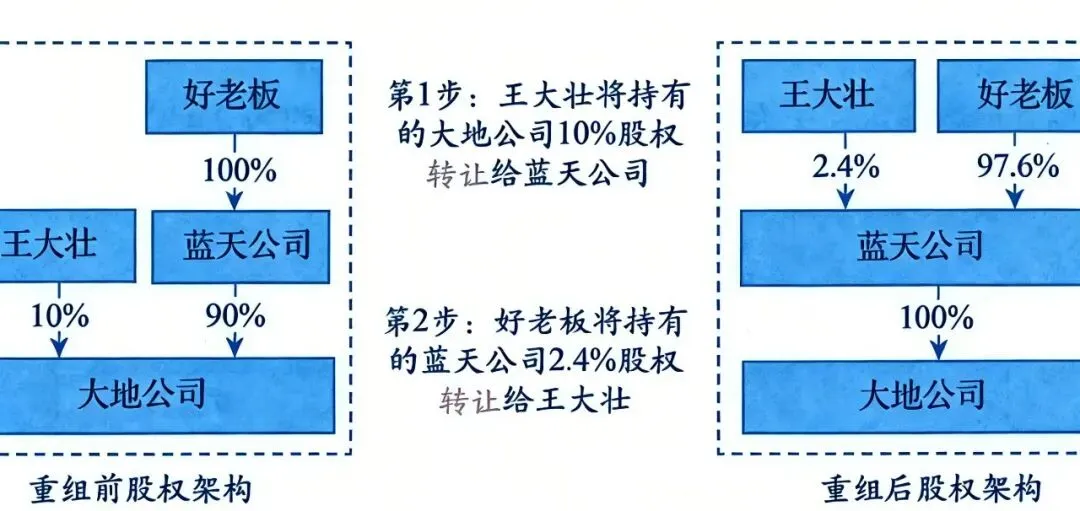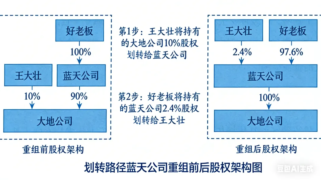 此路径下,王大壮将大地公司股权无偿划转给蓝天公司,好老板再将蓝天公司股权无偿划转给王大壮。这种方式因操作简单、不占用资金而在实务中被考虑,但税务风险极高。对于划出方王大壮和好老板,无偿划转同样属于“价格明显偏低”,会被税务机关核定转让收入。对于划入方蓝天公司,根据企业所得税法,接受捐赠可能被认定为“接受捐赠所得”,需缴纳企业所得税。对于个人划入方王大壮,虽然税法对个人接受非偶然所得的捐赠是否征税存在争议,但风险依然存在。因此,该路径通常被视为不可取。