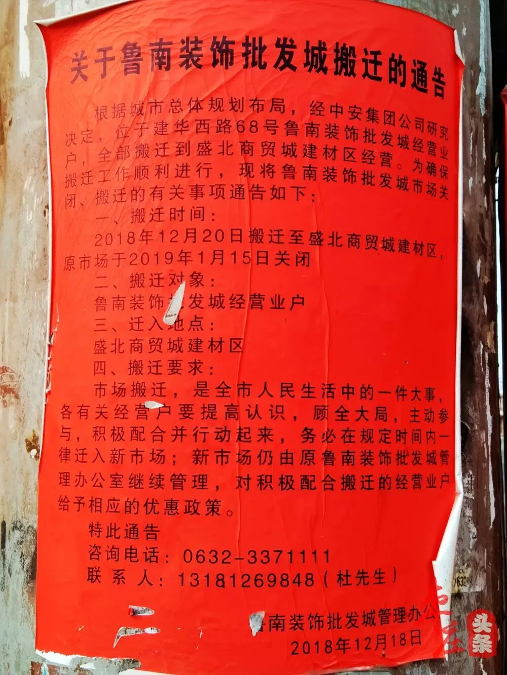 记者顺着刘女士所指的方向,在一处墙壁上看到了一份关于鲁南装饰批发城搬迁的通告,上面写到根据城市总体规划布局,经中安集团公司研究决定,位于建华西路68号鲁南装饰批发城的经营业户,全部搬迁到盛北商贸城建材区经营。