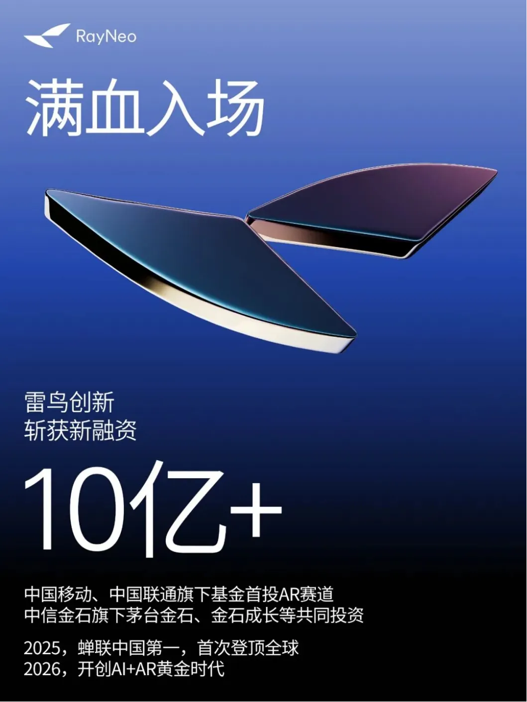 1月5日,公众号的老朋友AI眼镜龙头企业企业雷鸟创新技术(深圳)有限公司(以下简称“雷鸟创新”)宣布完成新一轮超10亿元融资,由中国移动链长基金与中信金石(旗下茅台金石、金石成长等基金)共同领投,中国联通旗下联创创新基金等机构参与。1、雷鸟创新