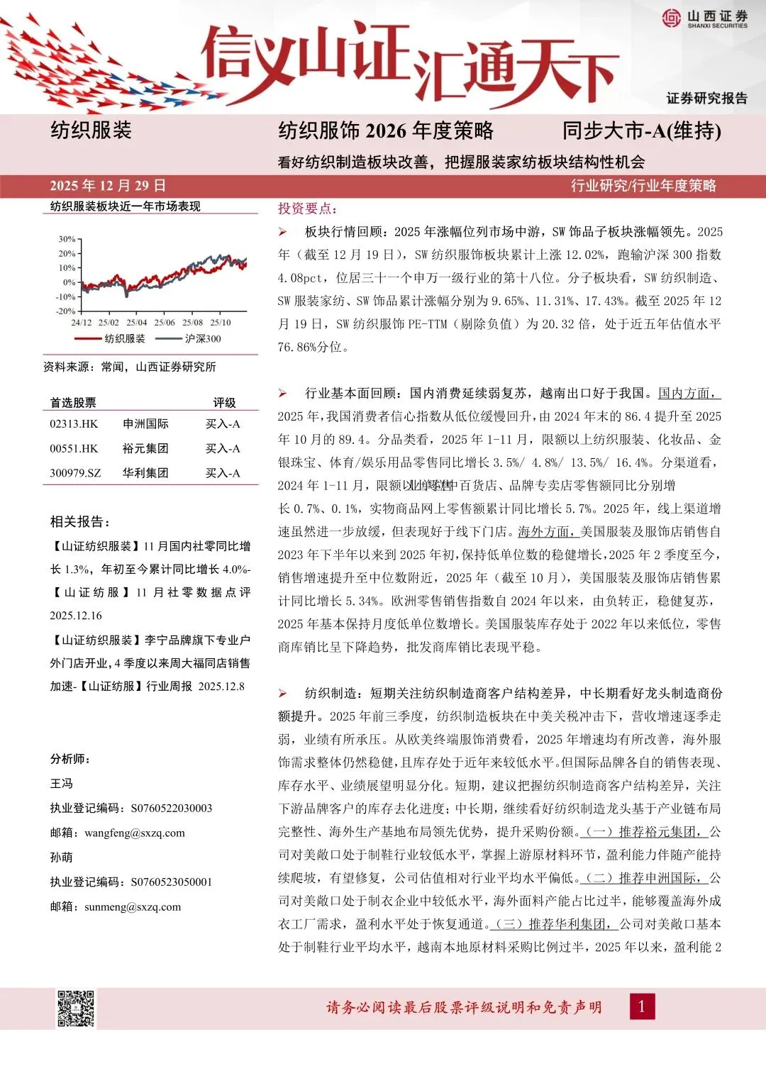 纺织服装行业2026年度策略:看好纺织制造板块改善,把握服装家纺板块结构性机会-251229-山西证券-30页