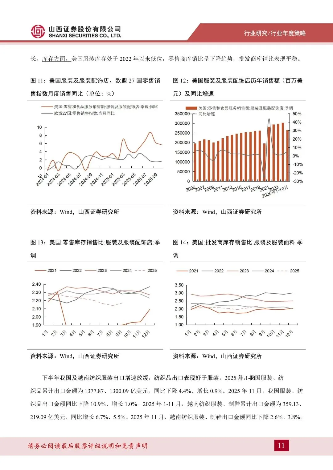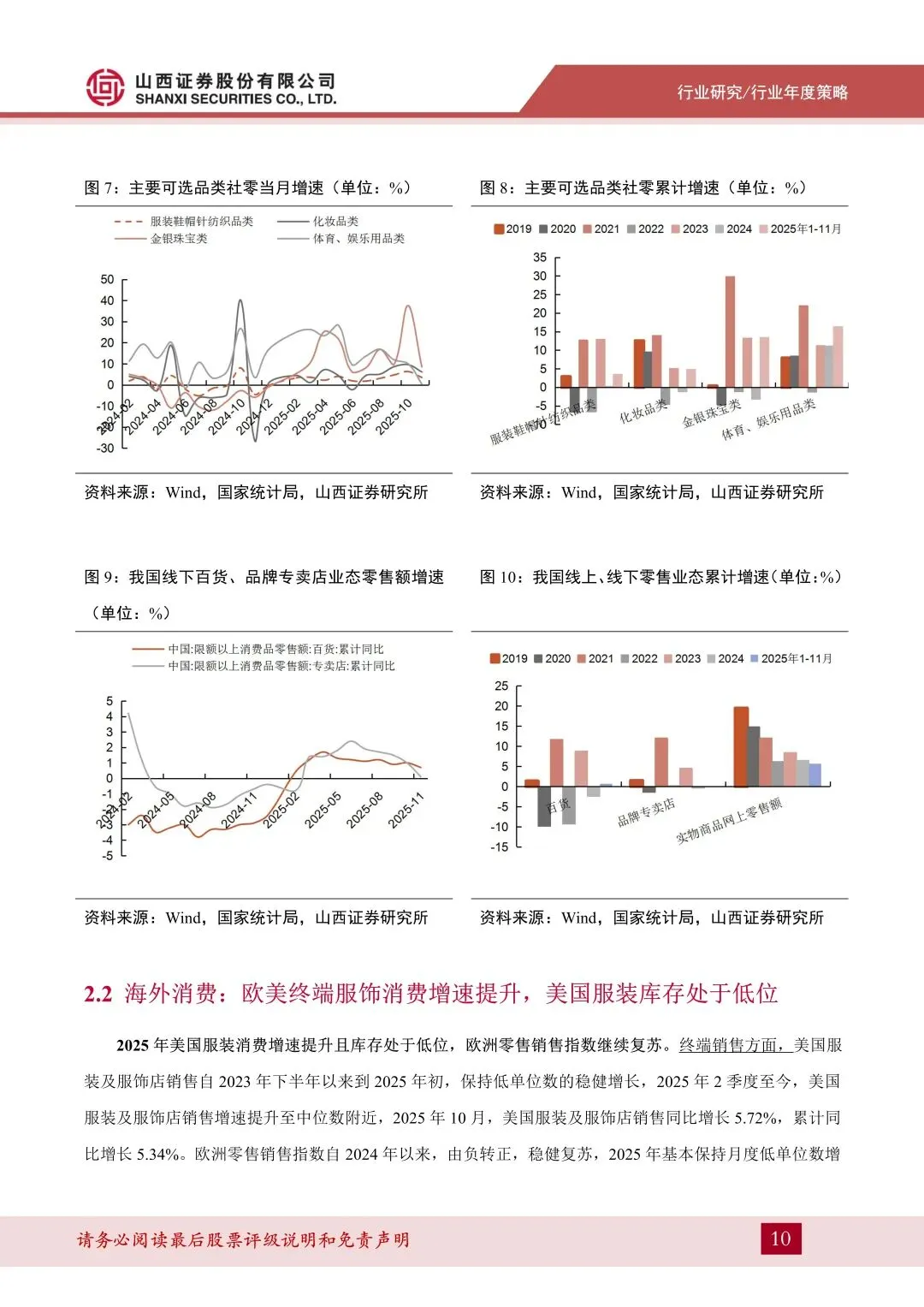 2025 年,线上渠道增速虽然进一步放缓,但表现好于线下门店。海外方面,美国服装及服饰店销售自2023 年下半年以来到 2025 年初,保持低单位数的稳健增长,2025 年 2 季度至今,销售增速提升至中位数附近,2025 年(截至 10 月),美国服装及服饰店销售累计同比增长 5.34%。欧洲零售销售指数自 2024 年以来,由负转正,稳健复苏,2025 年基本保持月度低单位数增长。美国服装库存处于 2022 年以来低位,零售商库销比呈下降趋势,批发商库销比表现平稳。