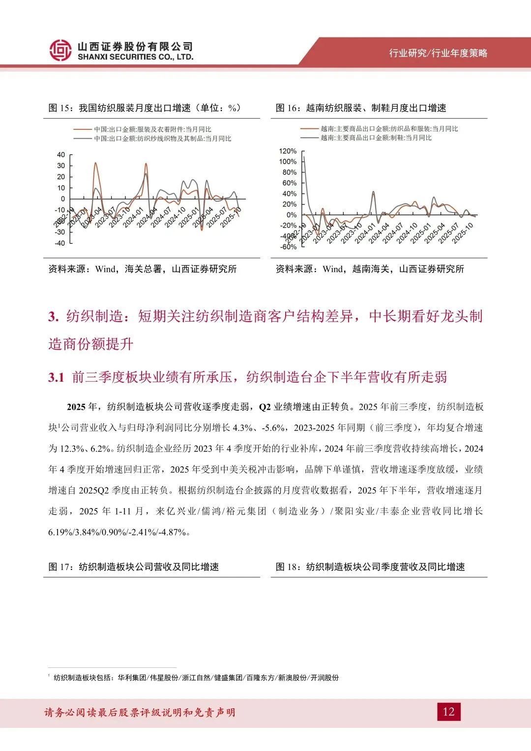 行业基本面回顾:国内消费延续弱复苏,越南出口好于我国。国内方面,2025 年,我国消费者信心指数从低位缓慢回升,由 2024 年末的 86.4 提升至 2025年 10 月的 89.4。分品类看,2025 年 1-11 月,限额以上纺织服装、化妆品、金银珠宝、体育/娱乐用品零售同比增长 3.5%/ 4.8%/ 13.5%/ 16.4%。分渠道看,2024 年 1-11 月,限额以业上单零位售中百货店、品牌专卖店零售额同比分别增长 0.7%、0.1%,实物商品网上零售额累计同比增长 5.7%。