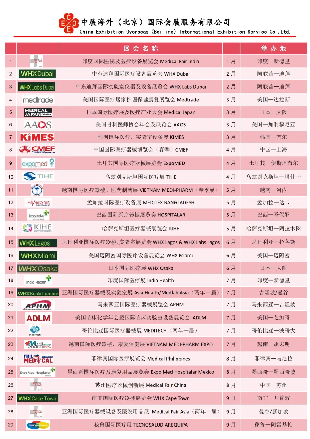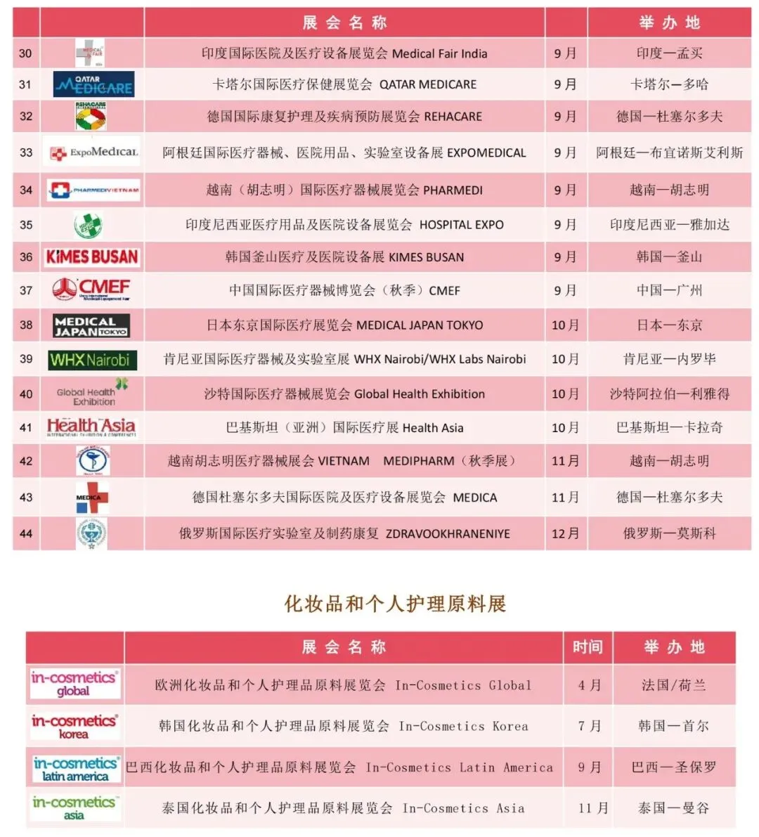 医疗设备和医疗技术、医用耗材、实验室和生物技术设备和产品、医院建设和医疗设施管理、骨科-物理治疗-康复、食品添加剂、皮肤美容产品、母婴用品等。