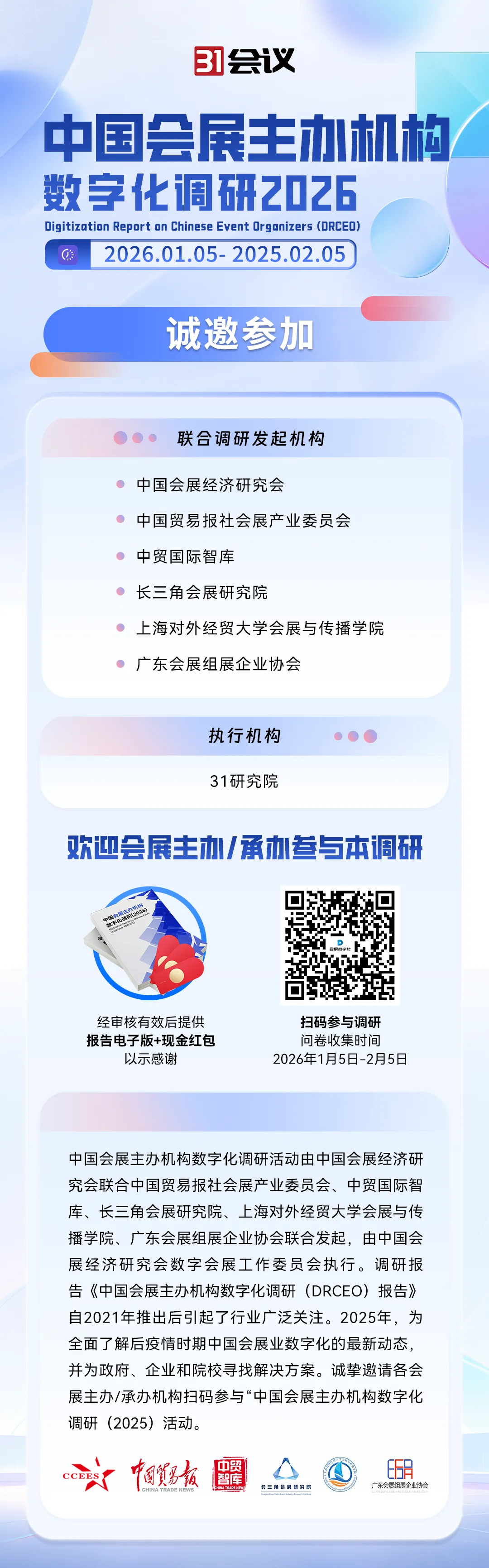 1月5日,由中国会展经济研究会联合中国贸易报社、长三角会展研究院、广东会展组展企业协会、上海对外经贸大学会展与传播学院发起,面向全国会展活动主办机构的“中国会展主办机构数字化调研(2026)”正式启动。自2021年以来,连续五年根据调研发布的《中国会展主办机构数字化调研(DRCEO)报告》引起了广泛关注。在“十五五”开局之年,面临AI智能体深入应用、会展出海数字化等最新趋势,发起机构决定启动第五届调研,以期全面了解中国会展业数字化的最新动态,形成一份能够准确而全面地反映当前形势下会展主/承办方的数字化转型探索与实践应用的调研报告,并为政府、企业和院校寻找解决方案。本次调研将从即日起持续至2026年2月5日截止。作为调研的执行机构,31研究院诚邀各展览和会议等会展活动的主办/承办机构继续参与“中国会展主办机构数字化调研(2026)”,凝聚合力,共助会展行业高质量发展!完成本次调研,需要5-10分钟左右的时间。完成调研,并留下完整联系信息,并经秘书处工作组确认为会展主办方的参与者,可获赠现金红包1份,表示感谢,请添加秘书处丽妍的微信(调研问卷结尾)进行兑换。