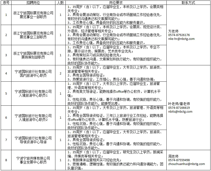 宁波文旅会展集团有限公司因工作需要,现对社会公开招聘人员,具体如下:
