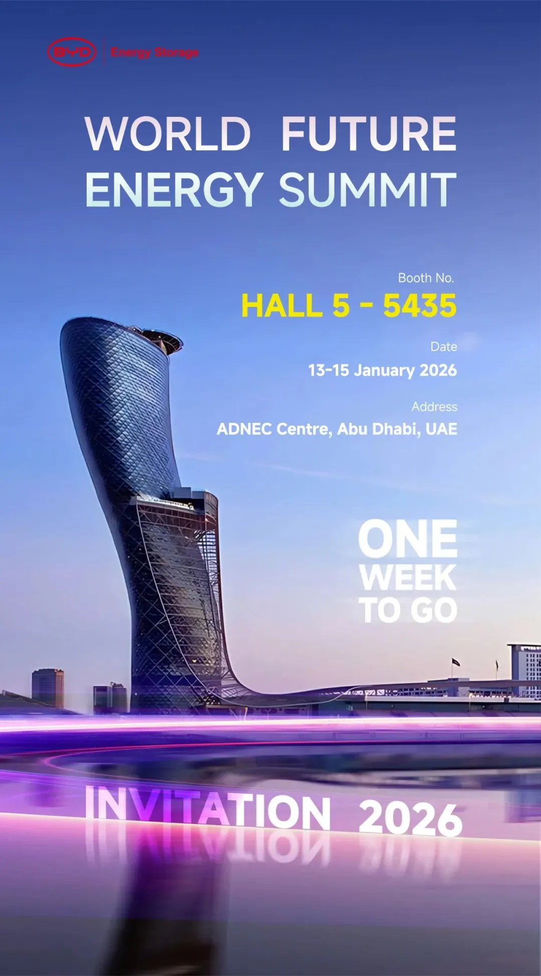 2026年世界未来能源峰会暨展览会将于1月13日-1月15日在阿联酋阿布扎比国家展览中心隆重举行。比亚迪储能将携Haohan、GC Flux PCS、GC Master EMS及户储产品亮相现场,与全球伙伴共探能源变革新路径。诚邀您莅临展位,见证可持续未来的更多可能。