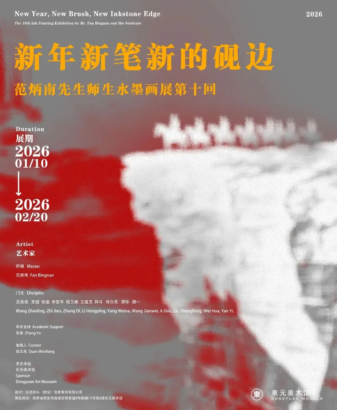 岁序更替,笔墨传情。2026 年 1 月 10 日,由东元美术馆主办、段文亮先生担任策展人、著名艺术评论家张渝提供学术支持的 《"新年新笔新的砚边"——范炳南先生师生水墨画展第十回》将正式拉开帷幕。此次展览不仅是范炳南先生艺术教学成果的第十次集中呈现,更是当代水墨艺术传承与创新的生动实践,将为新年的艺术界注入醇厚墨香与人文温度。