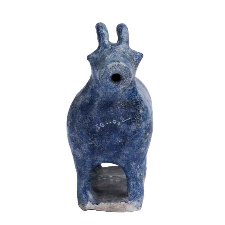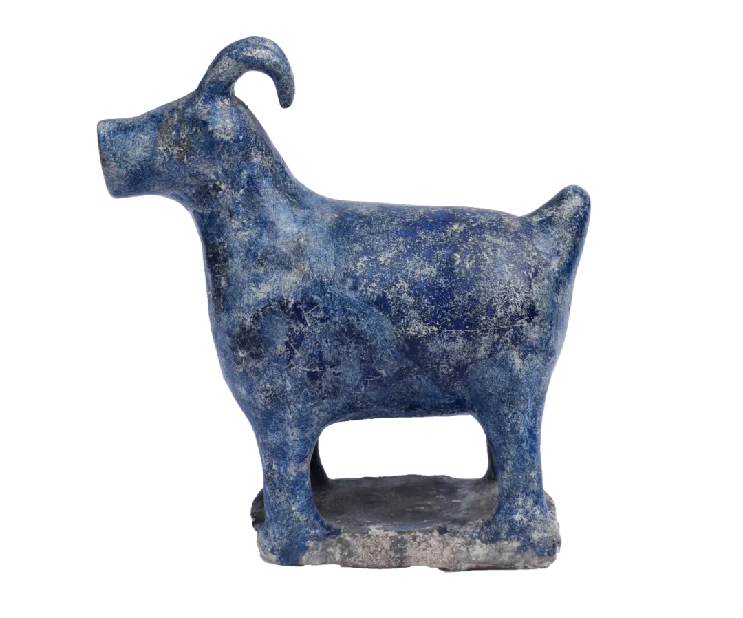 深蓝色的山羊形釉陶油灯,山羊四条腿被固定在长方形底座上,其头部有两个弯曲的角,嘴部中央有一孔。