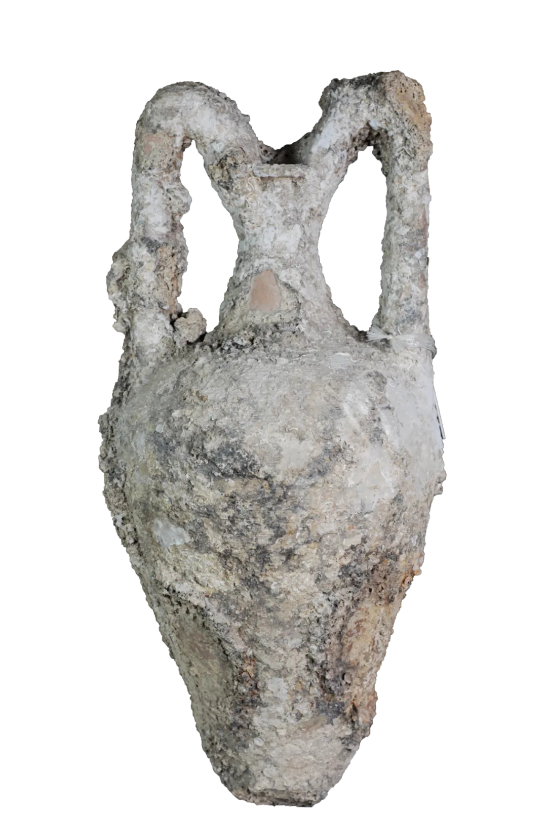 这件双耳陶瓶来自日本(E2-1185)水下发掘任务,表面覆盖密集的海洋沉积物。这种类型的器皿被广泛用于储存液体或固体,如谷物等,它们通过活跃的海上贸易来到叙利亚海岸附近。
