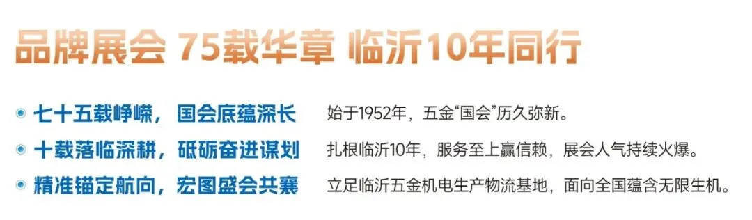 七十五载匠心铸辉煌,十年临沂聚力启新程,2026年9月5-7日,在临沂国际会展中心,我们期待与您共同见证这一里程碑式的时刻,携手开启五金行业的下一个辉煌十年!