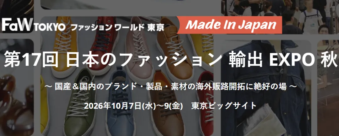 日本规模最大的时尚展——日本东京时尚流行成衣服装服饰,箱包,鞋类,饰品配件,布料辅料海外面料,时尚科技相关产品展览会FASHION WORLD TOKYO ( FaW TOKYO ),秋季展将于2026年10月7-9日在东京国际展览中心(Tokyo Big Sight)隆重举办!共计世界36国 1100社出展!日本最大のファッション展!东京时尚产业展!