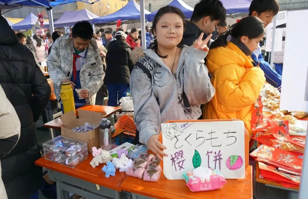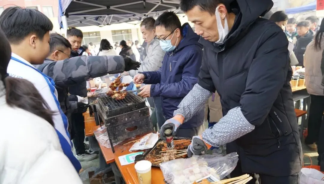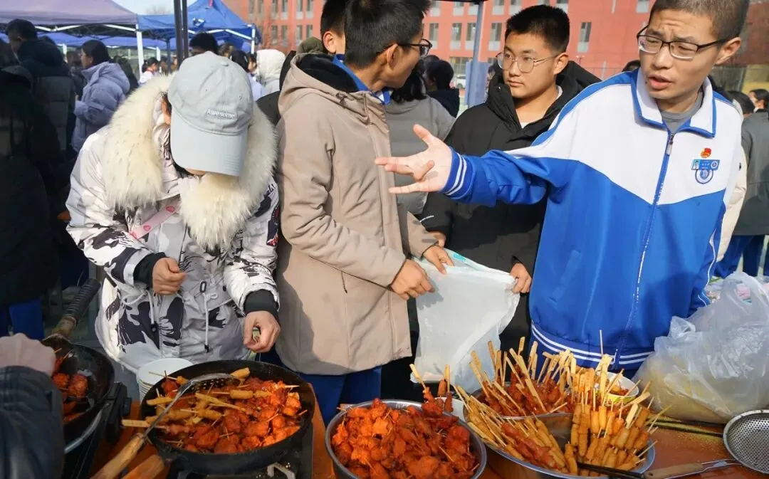 “爱心美食”是学生们的最爱,糖葫芦,火鸡面,烧烤,应有尽有,学生们边吃边逛,近情享受元旦前的美好时光。
