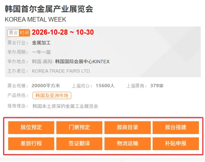 韩国首尔金属产业展览会(KOREA METAL WEEK)是韩国本土资深的金属工业展览会。划分了紧固件、压铸、汽车零部件、金属表面处理、3D技术、铝合金、激光与焊接等展区,协同效应非常明显。