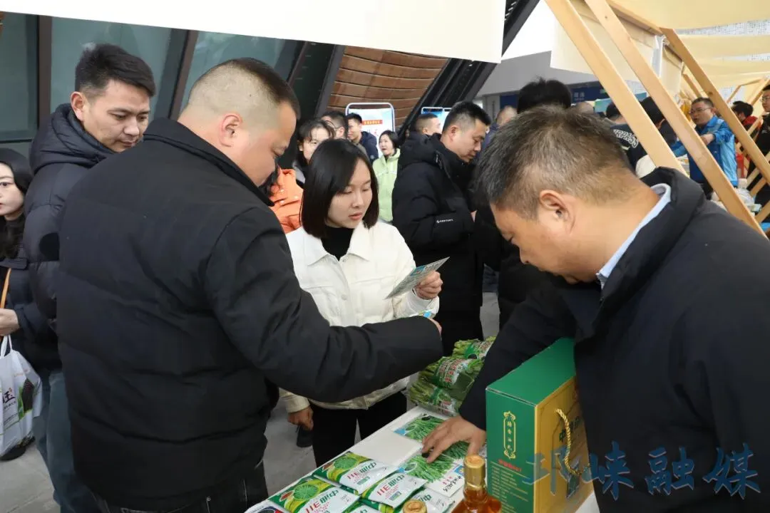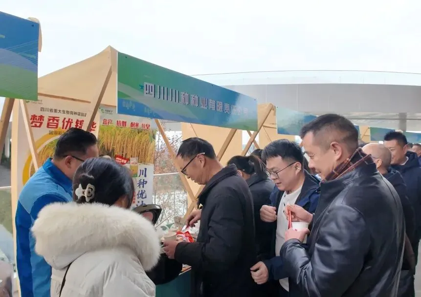 会场内交流热烈,会场外成果展示同样精彩纷呈。作为本次活动的重要配套环节,邛崃“村糖会”·天府农市—年货市的新品种展销区人头攒动、人气爆棚。科研院所和企业纷纷亮出新品种“王牌”,爆米花香型大米、鲜榨黑玉米汁、富硒油菜薹等特色农产品依次亮相,凭借独特的口感和优良的品质吸引了众多市民和采购商争先品鉴、踊跃采购。