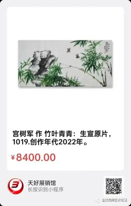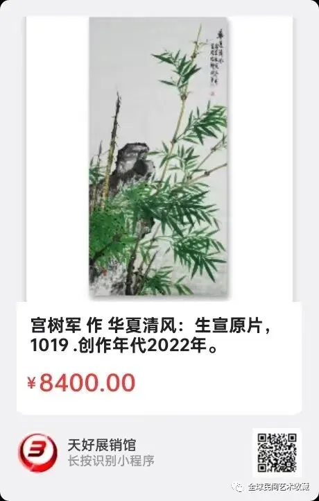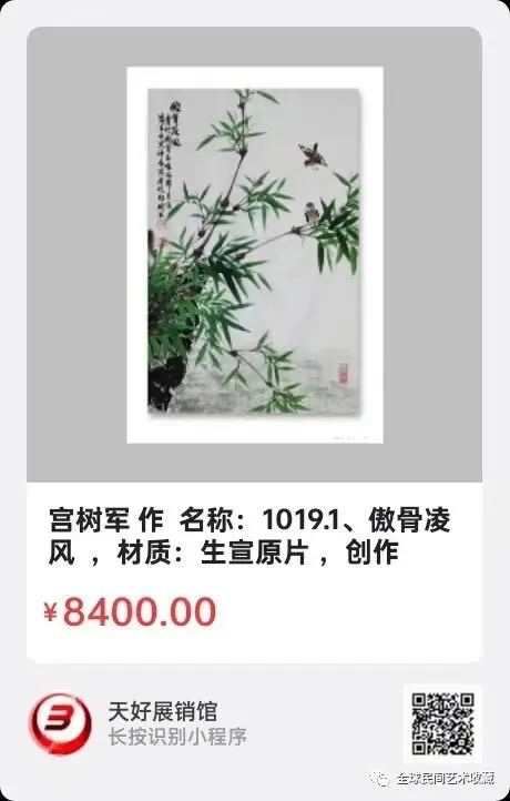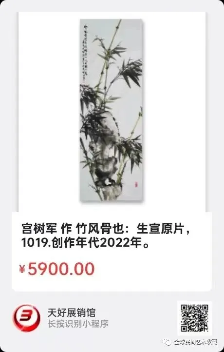 宫树军:汉族、1970年出生,河北省衡水市人,木艺师。师从徐悲鸿门下韦江凡弟子王相文先生。自幼学习探索郑板桥老师传统国画水墨竹。徐悲鸿美术教育示范基地。博鳌亚洲艺术人才研究中心研究员。中国香港国际艺术家协会会员。世界艺术家联合总会理事会副会长。现为北京中采集团《世纪采风》书画院副院长、中央电视台《藏宝天下栏目组》签约画家。中国教育电视台《水墨丹青栏目》签约画家,水墨丹青书画院副院长。中国东方文化研究会美育工作研究委员会客座教授。中国管理科学研究院商学院客座教授。河北省电视台公共频道《文化之旅栏目组》签约画家。人民美术出版社签约艺术家。中国炎黄书画院执行院长。中国书画院特聘书画家。北京胡润国际艺术品鉴定中心特聘书画家。上海宫蓓蕾国际书画院国画艺术委员会高级顾问。国际书画艺术家联合会签约艺术家。中国人物界新闻网特聘顾问。中国人民艺术网艺术顾问。中国书画家联谊会新文艺群体工作委员会委员。国礼艺术网顾问。国宝级艺术大师。中国楹联学会会员。国家高级美术师、一级美术师、衡水市美术协会会员。全国名人书画艺术界联合会委员、衡水市地毯工艺美术设计师、勾针设计师,职业画家。作品2018年被中国国际报告文学研究会国学文化传承委员会入编《大道之行》,2019年被中国文化进万家编委会收入《中国书画艺术年鉴》。2020年收入(1949—2019)中国书画家大百科。2020年7月16日受邀荣登企业家日报。2020年荣获十三届全国人大三次会议、全国政协十三届三次会议,全国两会胜利召开"向人民汇报.向两会献礼"活动官方重点推荐人民艺术家荣誉称号。2020年在全国抗疫情国画作品邀请展中入展作品《竹报平安》获得特等奖。2021年7月受邀参加中央电视台第二十一届世纪大采风智慧中国栏目组年度盛典,并获得当代著名画家杰出人物奖。2021、2022、2023、2024、2025年受邀入编《中国功勋艺术家》《大国艺术传世名家》《百年巨匠》《百年巨献.百年大家》《当代书画家全书》《中国近现代通史》《世界里的中国》《世界艺术巨匠大辞典》等等书刊。擅长画传统国画水墨竹。2021年被评为中国非遗领军人物。2021年作品为弘扬中国传统文化艺术被入选《传承经典.时代标杆》。2022年积极助力北京冬奥会,被中国新媒体组委会、一带一路文化旅游促进会《特别推荐艺术家》。2022年世界看冬奥.国家重点推荐艺术家。还荣登纽约时代广场《世界第一屏》。并多次参加国内外拍卖,雅昌网有查。