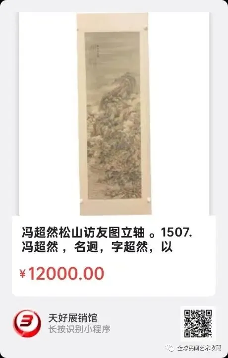冯超然松山访友图立轴 。长138 宽49厘米。冯超然 (1882~1954),名迥,字超然,以字行,号涤舸,别署嵩山居士,晚号慎得,江苏常州人。早年精仕女,晚年专攻山水,工行草篆隶,偶刻印。传世之作 传世之作有《仕女捧桃图》、《岁寒图》、《柳江秋燕图》,其中前两幅均收藏于上海博物馆,后者录於《中国现代名画》。出版有《冯超然临严香府山水册》、《冯涤舸画集》。此外还有《武夷叠嶂》、《秋山行旅》、《三圣图》、《苍山雪霁》等作品。来源1507。V.