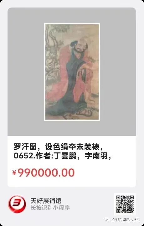 罗汗图,设色绢夲末装裱,尺寸87╳39,作者:丁雲鹏,字南羽,(1547一1628年)明代杰出宫廷画家,擅画宫廷,人物佛教题材,佛祖菩萨罗汗在他笔下栩栩如生,庄严肃穆。其画作多藏于国家古宫博物院和台北博物馆。公司交易,來源0652。