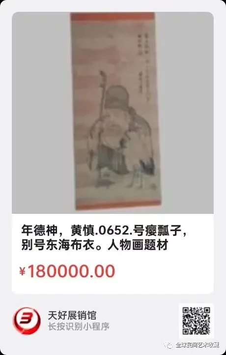 年德神,外尺120CmX43.内心尺65Ⅹ31.黄慎(1687一1772),号瘿瓢子,别号东海布衣。人物画题材丰富,擅画神仙佛道,历史名人,也擅画民间下层人民形像,在古代画家当中是十分难得的。是清代杰出的画家,为扬州八怪之一,擅草书,以狂草笔法作画。公司交结,来源:0652.