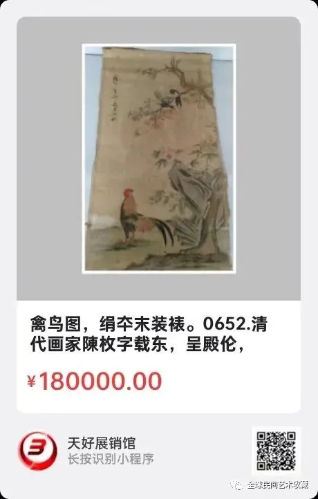 禽鸟图,绢夲末装裱,外尺120cmx43cm,内心尺65cm╳31cm。清代画家陳枚(1694一1745年)字载东,呈殿伦,晚年号枝窝头佗。雍正四年供奉内廷,为雍正,乾隆时期宮廷画家。精于山水,人物花鸟画作。能于寸尺纸缣图群山万壑。乾隆元年与孙祐等五人同绘《清明上河图》,五年与孙祐等六人共绘《庆丰园》,其画同录于《石渠宝籍》。为清代著名画家。來源0652。