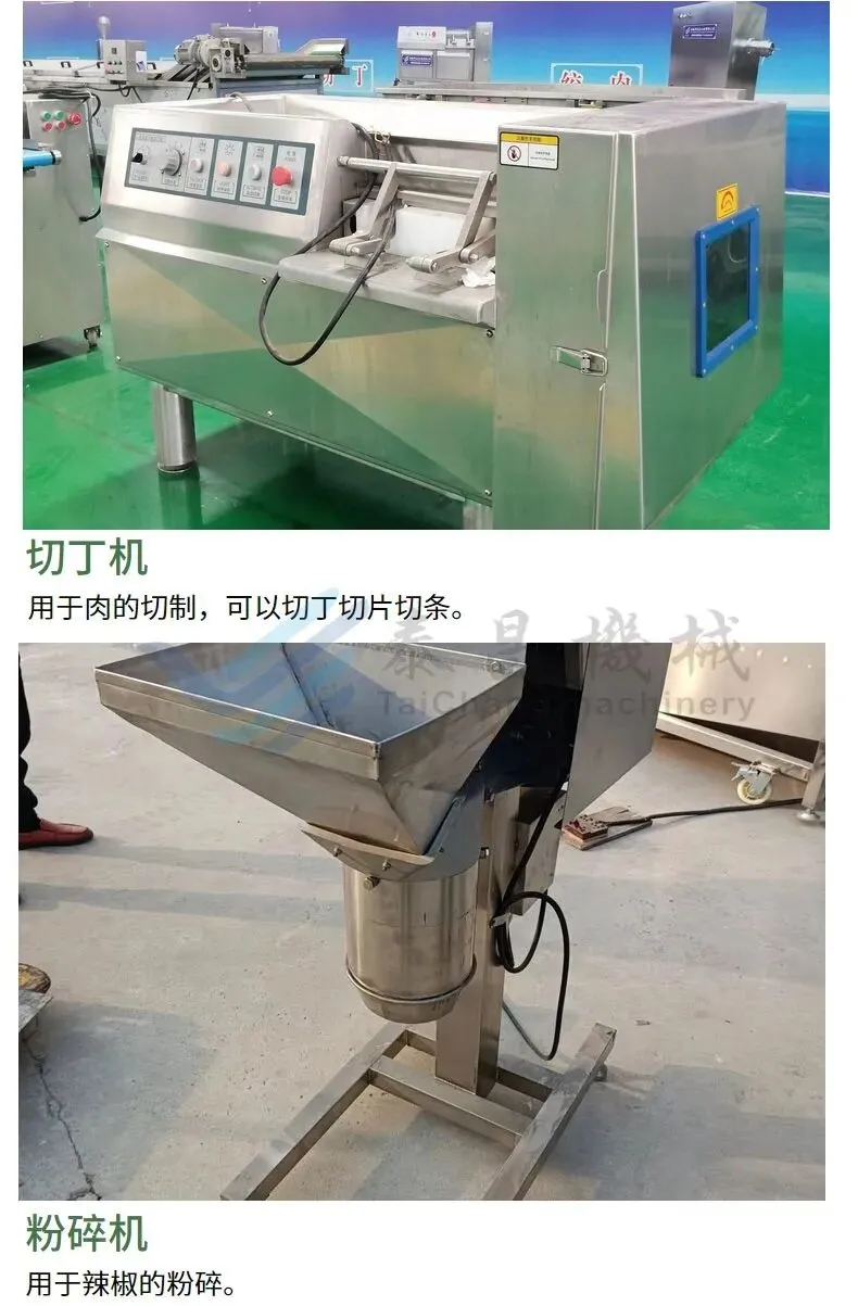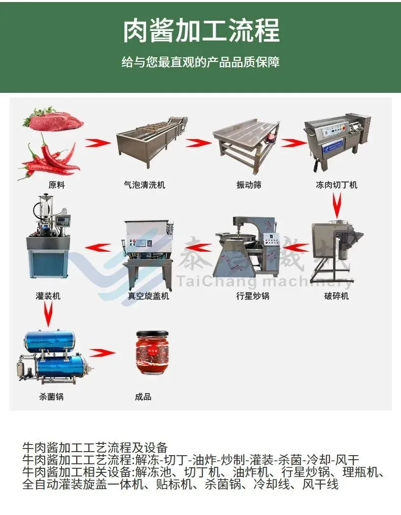 牛肉酱加工相关设备:解冻池、切丁机、油炸机、行星炒锅、理瓶机、全自动灌装旋盖一体机、贴标机、杀菌锅、冷却线、风干线