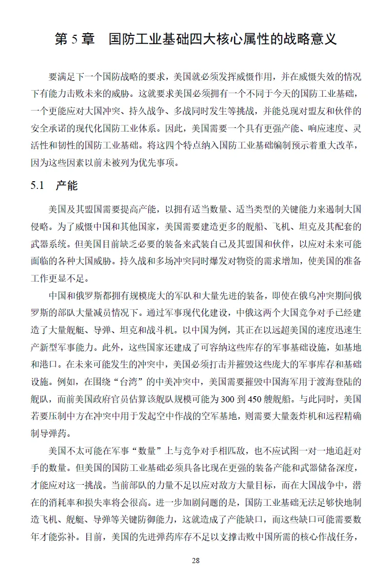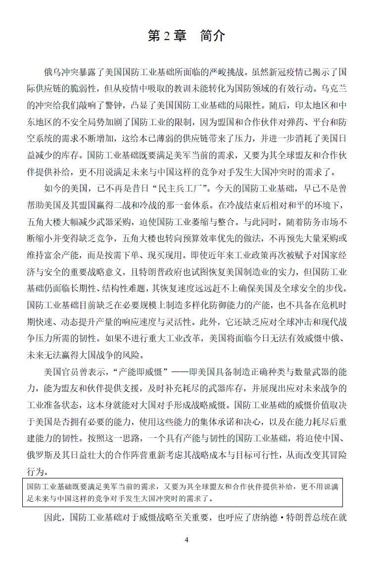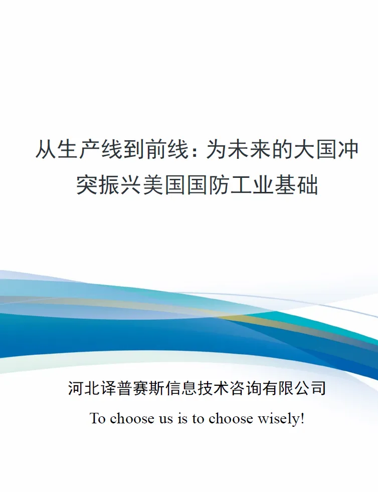 本报告全面分析了美国国防工业基础在当前地缘战略环境下的脆弱现状及其对未来大国冲突准备能力的不足。报告指出,美国国防工业基础面临三大核心问题:产能不足、需求信号不明确以及官僚化流程僵化。多年来,行业整合和采购不确定性削弱了工业基础的规模、灵活性和韧性,使其难以满足对乌克兰、印太及中东地区的军援需求,更难以应对与中国等先进对手可能爆发的高强度冲突。