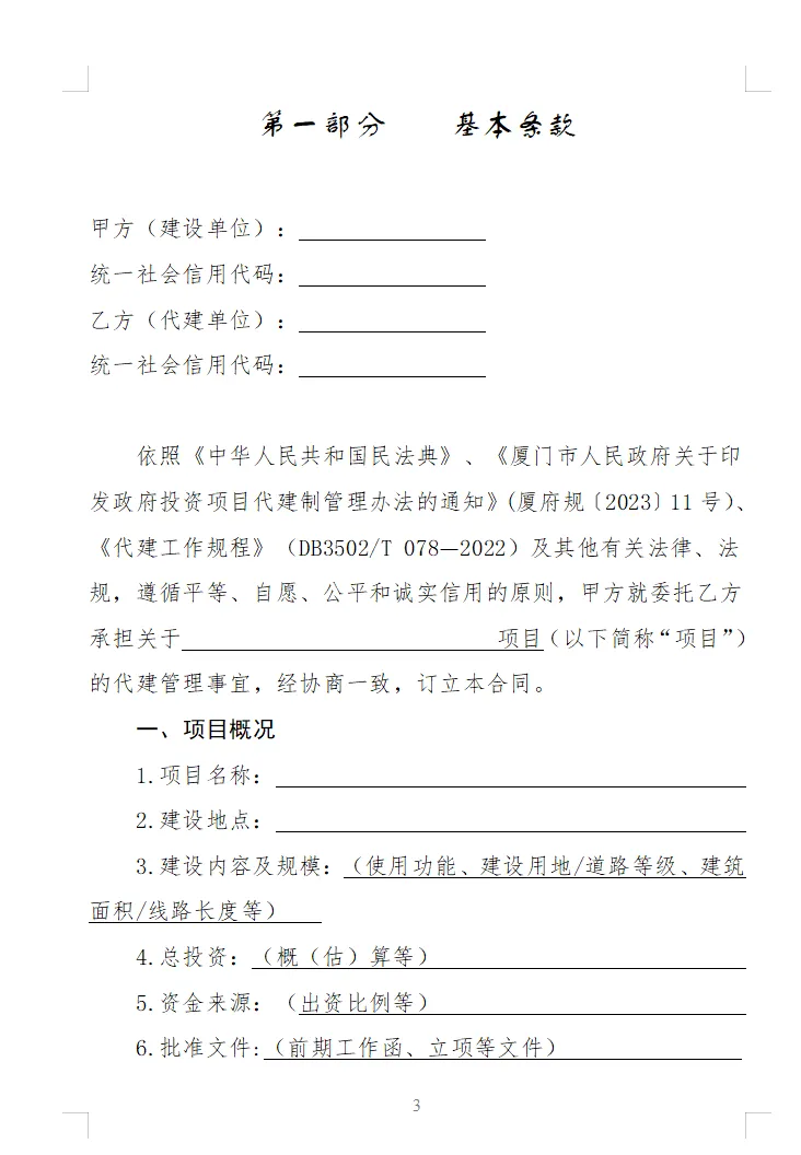 根据《厦门市人民政府关于印发政府投资项目代建制管理办法的通知》(厦府规〔2023〕11号),市住建局结合实际,制定了《厦门市政府投资项目代建招标文件示范文本(2025年版)》《厦门市政府投资项目代建合同示范文本(2025年版)》等2个文件,现予以发布,供各相关单位使用。