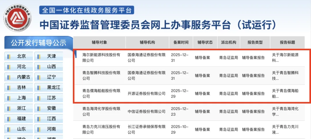 此番3家企业密集动作,为2026年青岛的“上市后备军”增添了更多力量——截至去年12月31日,青岛辅导备案企业达25家,创下历史最好水平。