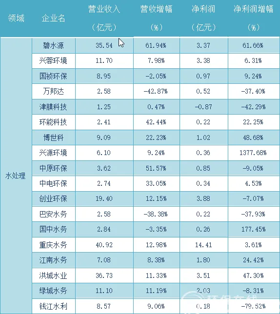 只有 4 家企业营收出现同比下滑,碧水源、环能科技、中原环保收入增幅则达 61.94%、42.44% 及 51.57%。