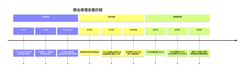 2012年6月,商务部同意在天津滨海新区、上海浦东新区开展商业保理试点;12月,同意港澳投资者在广州市、深圳市试点设立商业保理企业,商业保理正式在我国拉开序幕。商业保理在我国的发展,是一个典型的“自下而上”探索与“自上而下”规范相结合的过程,详见下图:商业保理发展历程。试点启航与爆发增长:为探索信用服务业发展,商务部于2012年批复在天津滨海新区、上海浦东新区开展商业保理试点。商事制度改革后,部分地区将商业保理企业视为一般工商企业直接登记注册,特别是2017年全国金融工作会议后,部分省市出现“抢注现象”,行业数量呈现爆发式增长。截至2019年6月末,全国已注册商业保理企业高达12,081家。监管规范与市场出清:行业的“野蛮生长”也伴随着风险隐患。2018年,监管职责从商务部划转至银保监会,标志着行业进入 “强监管”周期。2019年,银保监会发布《关于加强商业保理企业监督管理的通知》,明确了风险资产不得超过净资产的10倍等一系列关键监管指标,并开始对存量企业进行分类处置,大量“失联”“空壳”企业被清理,行业走向“减量增质”。截至2023年末,存续的商业保理企业降至5,467家,但业务量持续增长,行业集中度提升。三、商业保理的模式