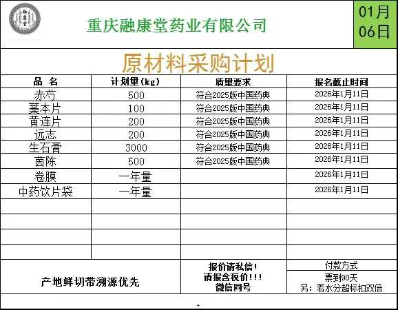 重庆融康堂药业有限公司招标采购6个品种 免费查看采购联系方式 中药材采购招标计划2026.1.6