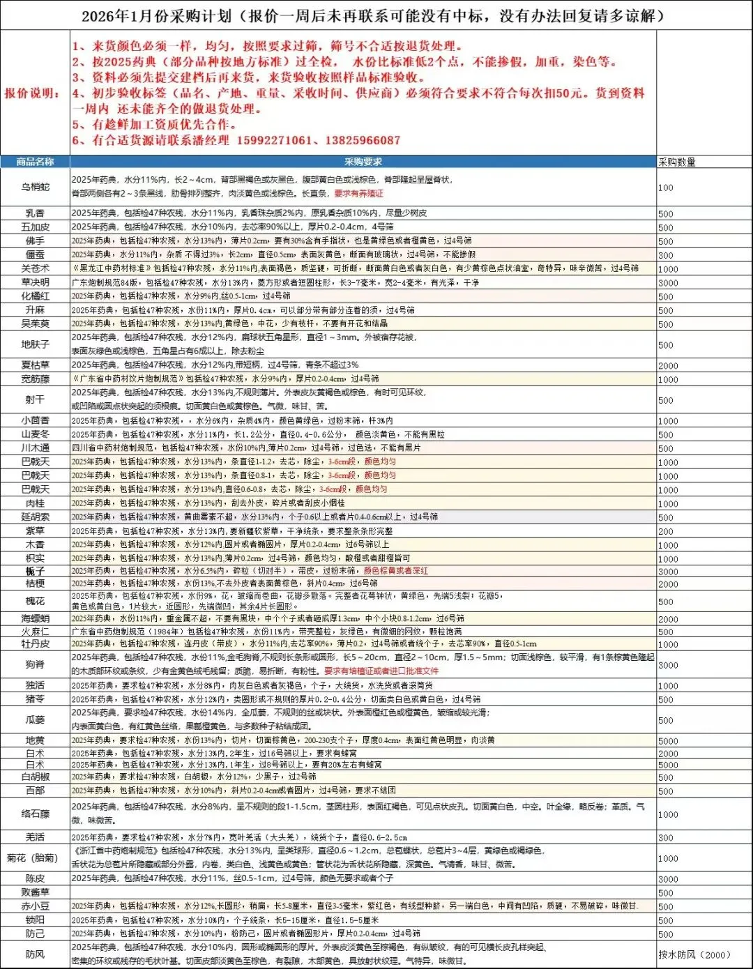 广东深华药业有限公司计划采购46个品种:乌梢蛇、乳香、五加皮、佛手、僵蚕、关木通、草决明、灯心草、红花、吴茱萸、地肤子、夏枯草、宽筋藤、射干、小茴香、山麦冬、川木通、巴戟天、肉桂、延胡索、紫菀、木香、枳实、栀子、桔梗、槐花、海螵蛸、火麻仁、牡丹皮、狗脊、独活、猪苓、瓜蒌、地黄、白术、白胡椒、百部、络石藤、羌活、菊花(胎菊)、陈皮、败酱草、赤小豆、锁阳、防己、防风