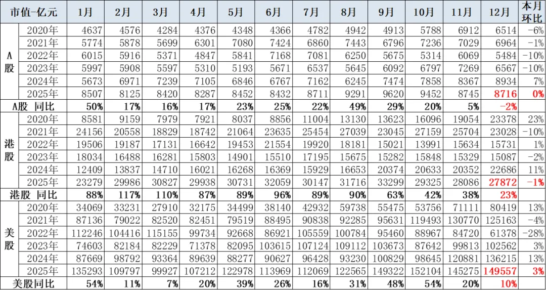 而国内A股市场总体来看,从2024年1月份的5673亿元到2025年12月份的8716亿元,总体增长相对比较平缓;而美股市场从2023年1月的74603亿元上升到2025年12月的149557亿元,增长幅度也相对较大。