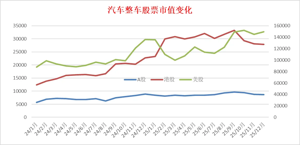 从A股和港股、美股的汽车整车企业股市值走势来看,今年港股的市值走势表现相对较强,相对于美股的市值走势,港股市值走势的上市趋势是比较明显的,从2024年10月份的港股的整车企业市值合计2.0万亿元规模,到2025年的12月份达到2.8万亿元,港股的汽车股的规模实现了市值大幅增长的特征,其中有新股上市的因素,也有股票市值的增值因素。