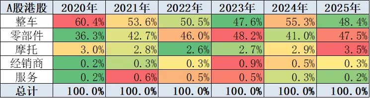 我们把中国车企和零部件企业的A股、港股、美股的三地市值汇总看,12月股票市值的汽车零部件占比47.5%(同期41%)表现较强,整车企业市值占比48.4%(同期55.3%)的下降较快,虽然有奇瑞的加入,但市值占比仍是明显下降。