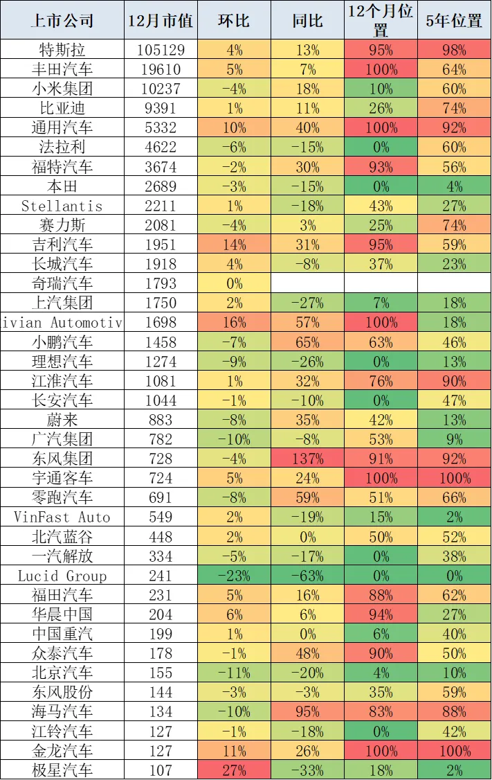 12月汽车整车企业市值变化相对较大,特斯拉较顽强。12月份相对于11月份表现较强的是日本车企,其它二线车企的市值提升主要是商用车的增长效果。