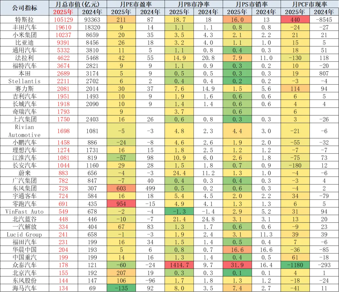 汽车整车公司从综合的市盈率、市净率的表现来看,应该说特斯拉等新势力企业的市盈率相对是比较偏高的。尤其是特斯拉10万亿元的规模,市盈率达到200倍的水平,而像零跑汽车、岚图汽车等市盈率也是新能源车初期的市盈率相对较高的情况。