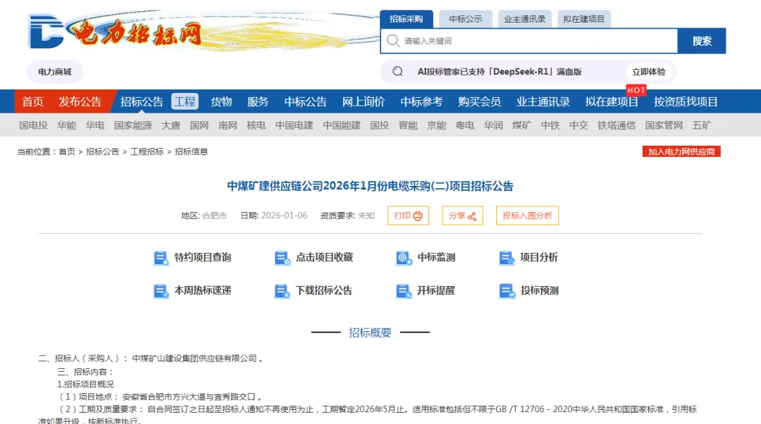 新年首月,2 月 6 日,中煤矿建供应链公司连续发布两则重要电缆采购招标公告。这些电缆作为电力传输的关键部件,涉及动力、控制等多种电缆型号,数量可观。此次招标在中煤矿建使用的中国电力招标网发布信息,吸引了诸多企业关注。集中采购通过该招标网的优势,既能降低成本,又可确保产品质量统一,满足项目对电力设施高要求。