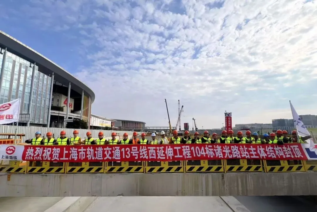 2025年12月,随着最后一块顶板混凝土浇筑,由上海建工承建13号线西延伸工程104标国家会展中心站(诸光路站)主体结构封顶。