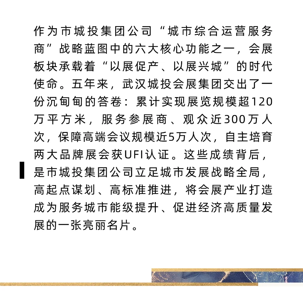 回首“十四五”,武汉城投会展集团实现了从有到优的跨越式发展,完成了品牌化、标准化、国际化的初步布局,充分发挥市城投集团公司在场馆和组展的双核优势,打造产业链“链主”企业,通过强链培优,提升规模能级,打造具有特色的现代会展产业生态圈。展望“十五五”,武汉城投会展集团将持续深化“大会展”体系内涵,让会展产业成为武汉城投服务城市战略的“关键支点”、展现武汉发展活力的“城市窗口”,为武汉加快建设国家中心城市、打造国家会展中心城市贡献城投力量!