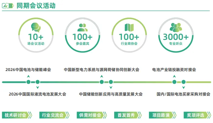 本届展会期间将举行“2026中国国际液流电池发展大会”、“中国储能创新应用与高质量发展大会”和多场平行论坛、新品发布、资源对接、颁奖典礼等配套活动,围绕新型电力系统和新型能源体系建设、新型储能、电池、绿色智算、水风光储氢一体化、绿色能源、充换电等行业热点,邀请电力能源、电池技术领域权威专家进行深入交流,探讨绿色能源新技术、新模式、新业态,助力能源产业数字化、智能化、绿色化转型,实现高质量发展。
