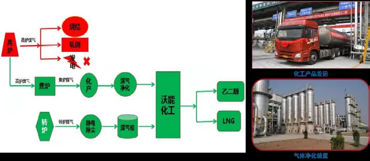 (三)采用“钢-焦-化-氢”联产新工艺。与晋南钢铁、沃能化工合作,利用转炉和焦炉煤气合成乙二醇和天然气,将煤气中的一氧化碳转化为化工原料,较传统煤气燃烧发电,年减排 136 万吨二氧化碳。